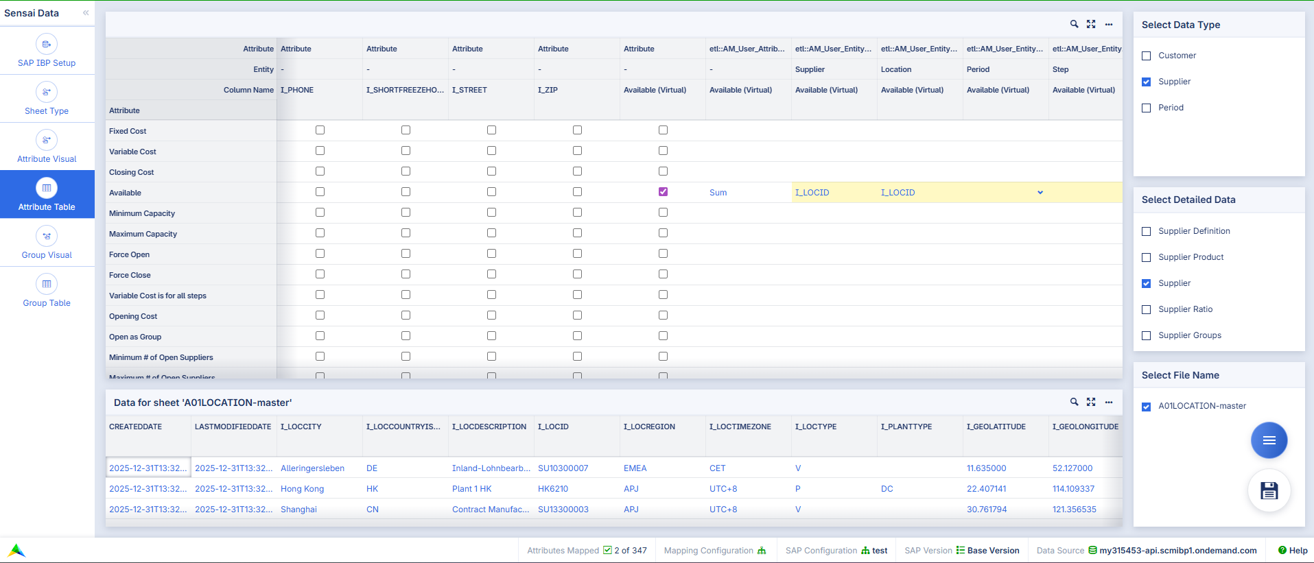 This page provides an alternative view of the current mapping between SC Navigator attributes and the input data. Unlike the Attribute Visual page, the mapping is presented in a tabular format instead of a drag-and-drop interface. All other functionality is identical to the Attribute Visual page.